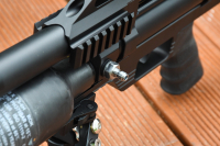 When it came to hunting, the effectively shrouded barrel with replaceable liner and little wasted air was already minimal for noise and the ability to add an additional moderator makes this gun even quieter in use, especially noticeable within resonant echoing barns. Being sub-12, the left side power adjuster only goes DOWN from 12-ft-lbs and although you can see machined recesses for the missing micro adjuster (found only in FAC format), but on the other hand, will many airgun shooters want to venture below 12 ft-lbs for hunting, other than in very close confines with delicate backstops? Of course, a Picatinny rail allowed me to swap to night vision use without problems and gain correct eye relief without strain, the butt pad offers 20mm of vertical adjustability, grips your shoulder well and features frontal finger grooves for additional grip if pushed into your shoulder with off trigger hand.