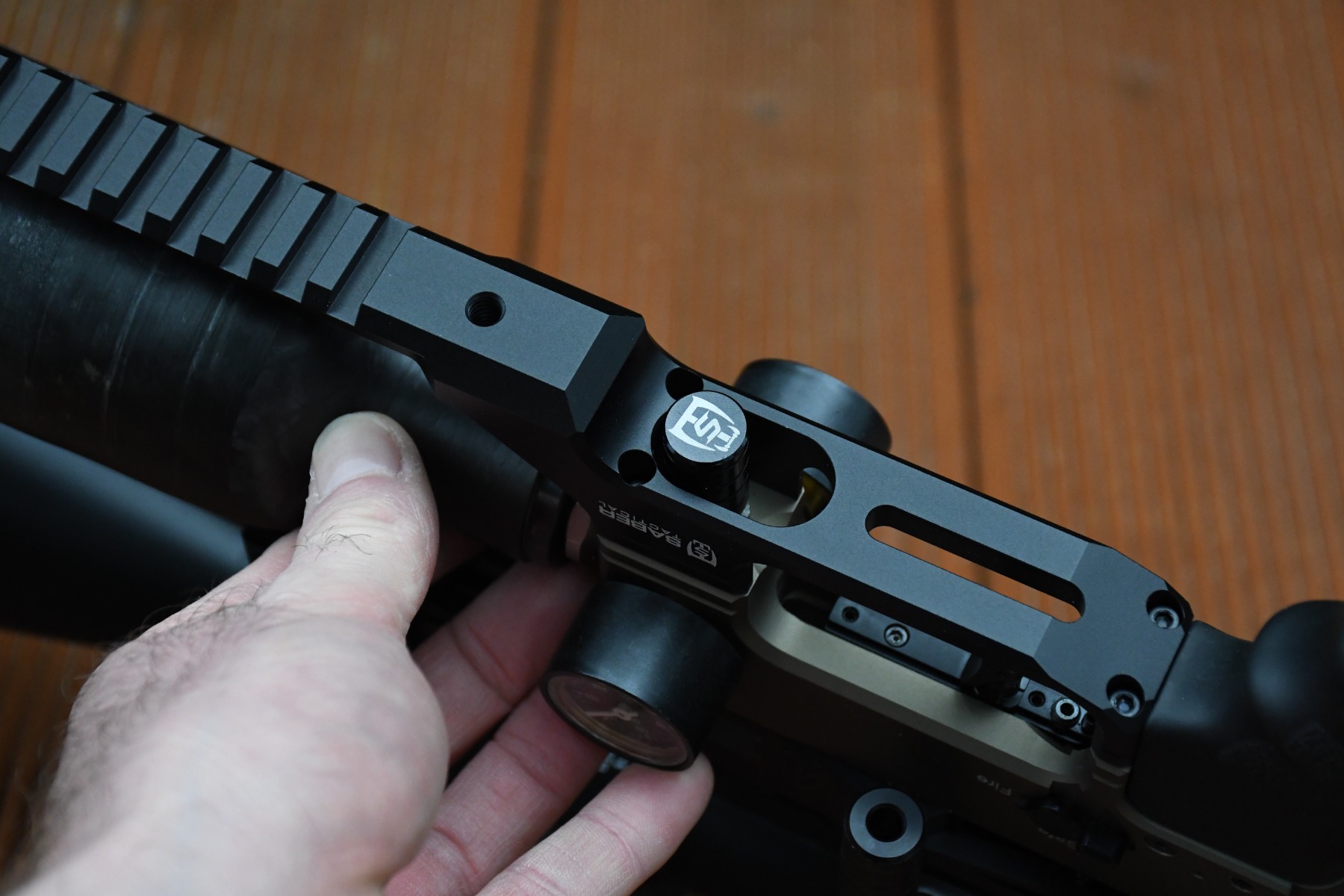 The M3 in its bullpup format, is perhaps the king of the FX range, large volume 28 round magazine in .22 with likely 300-400 round shot count from the 250 Bar fill pressure. Stating statistics is difficult as depending on barrel length and cylinder volume, all can vary slightly, yet FX’s comprehensive website seems to offer data that is believable in the real world depending on your choices. Handling character is rearward weighted with a high vertical profile to the rifle with possibility to rest using the buddy bottle or with an extended underside Saber Tactical Picatinny rail for bipod. The carbon fibre bottles don’t draw the heat from your supporting hand like aluminium will although with a full aluminium chassis layout, the rifle is always going to be comparatively cold to hold without gloves in winter. I chose bronze colouration as I like a little contrast from just black and the looks will always polarise opinion, yet this is a rifle idealised for mechanical perfection and superior airflow through the regulators for accurate performance. The new shorter side cocking lever is most definitely lighter to operate and with a short throw, extremely fast in operation. Left handers are now assisted by the possibility of swapping this lever to the left side of the gun although magazine must remain to the right side of the rifle. Although large, this doesn’t seem to interfere with cheek or chest position in close proximity to the rifle other than with heavy jackets or rucksack. Plentiful lateral picatinny rail offer mounting positions for accessories and the upper 20 M.O.A. rail provides plentiful scope mounting linear space and range boosting elevation. This is perhaps more applicable to FAC versions and slug shooters yet it never harms a sub 12.